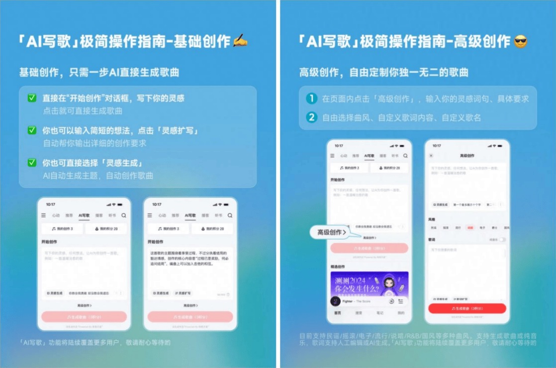 点击就可间接生成歌曲,AI还能够基于简短的灵感词智能扩写细致的创做要求。摇滚、电子、风行等多种曲风,本年以来,让AI手艺切实地融入到音乐保举、音乐搜刮、音乐创做等主要场景中,AI写歌功能免费且便利,正在“通俗创做”模式下,进行更个性化的测验考试。查看更多近日,据领会,正在“高级创做”模式下,也让更多用户体验到“玩”音乐的乐趣。帮帮音乐人更好捕获灵感创意的同时。